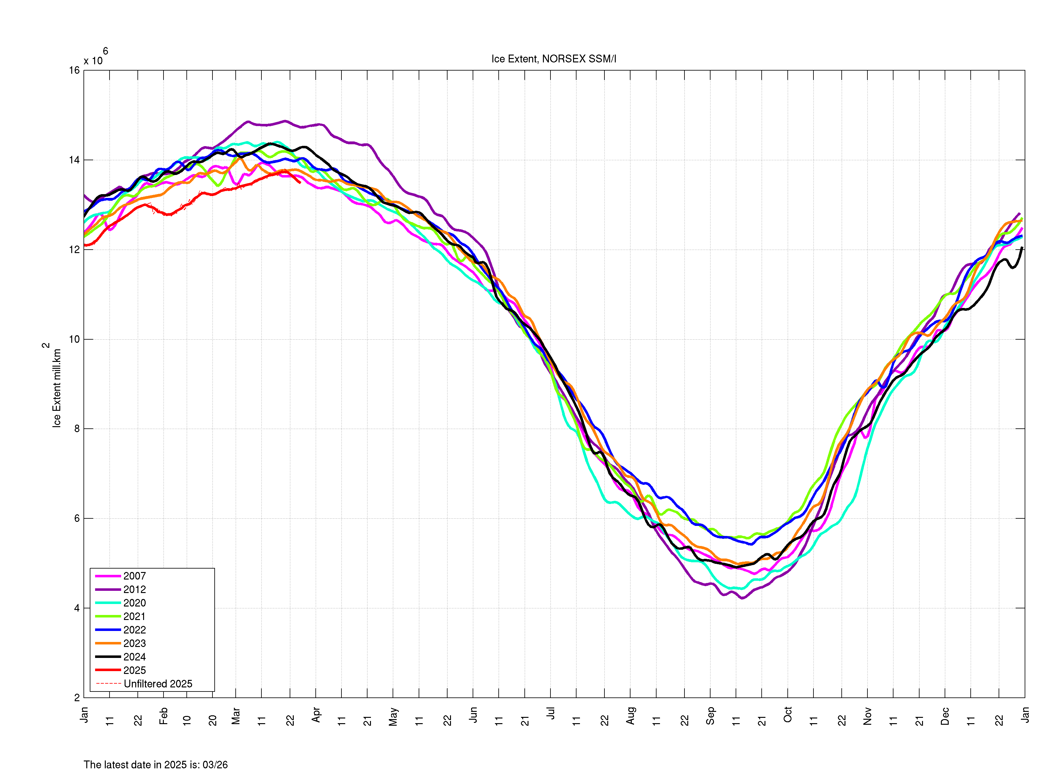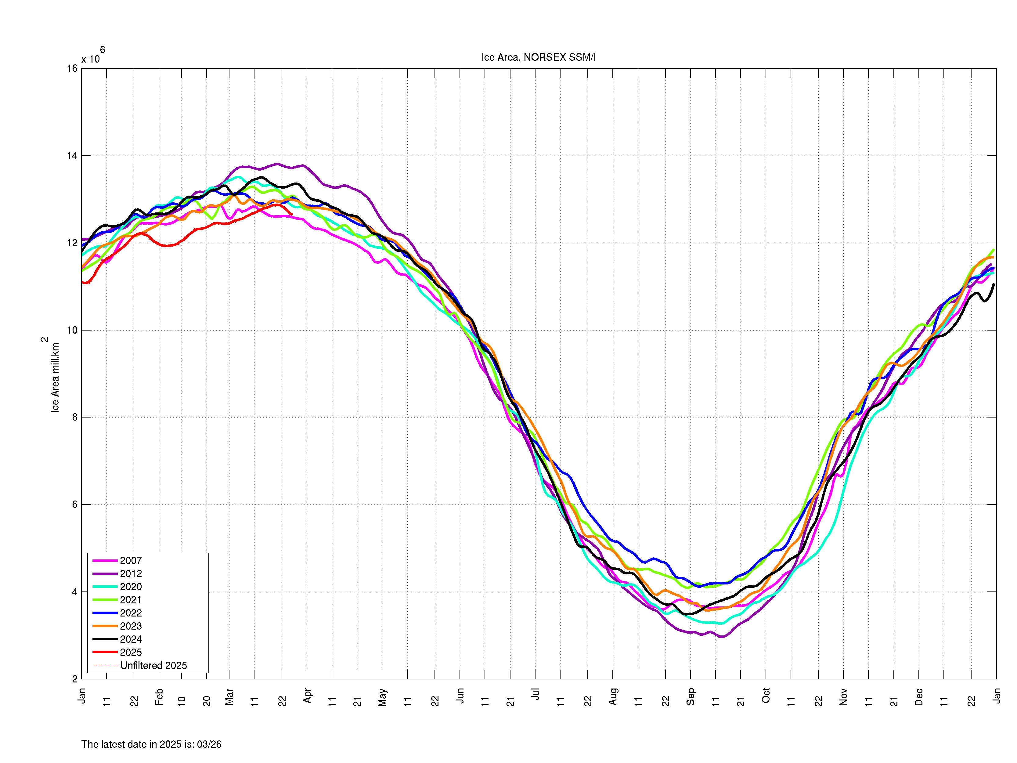 Data Attribution: The data provided on this website is sourced from the Nansen Environmental and Remote Sensing Center (NERSC) Arctic Sea Ice Observing System (https://iceobs.nersc.no), using the NERSC developed NORSEX Sea Ice algorithm. It uses DMSP SMM/I Brightness temperatures (https://nsidc.org/). It is updated daily and intended for informational purposes only. If you use or reference this data, please attribute it to "NERSC Arctic Sea Ice Observing System" and include a link back to this website (https://iceobs.nersc.no). NERSC makes no warranties regarding the accuracy or completeness of the data.